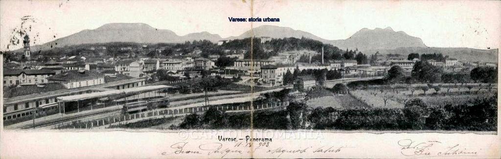 | Keywords: Immagine presa da Giubiano: panorama di Varese e di Biumo Inferiore. In basso a sinistra la stazione delle Ferrovie dello Stato (1865), alle sue spalle lo stabilimento della Carrozzeria Macchi e la cupola del Politeama. Più a destra l'imbocco di via Morosini con l'albergo Isola Magenta, al centro l'edificio del Calzaturificio di Varese e si intravede nascosta dagli alberi e da una villetta, la stazione delle Ferrovie Nord Milano (1885). Nella seconda cartolina i Molini Marzoli Massari sovrastati da alte ciminiere. varese |