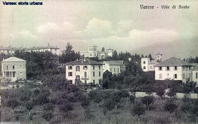 Keywords: Panorama sul colle di Bosto coperto di ville e giardini. In alto a sinistra villa San Pedrino. varese
