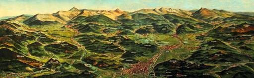 Keywords: Panorama Kotlina Karkonosze.jpg Karkonosze Mountains Riesengebirge and Kotlina Jeleniogórska Hirschberger Tal around 1925 Panorama des Hirschberger Tals mit Riesengebirge Blick aus Richtung Norden Kolorierte Zeichnung vor 1930 PD-Art Krkonoše Artworks missing infobox template
