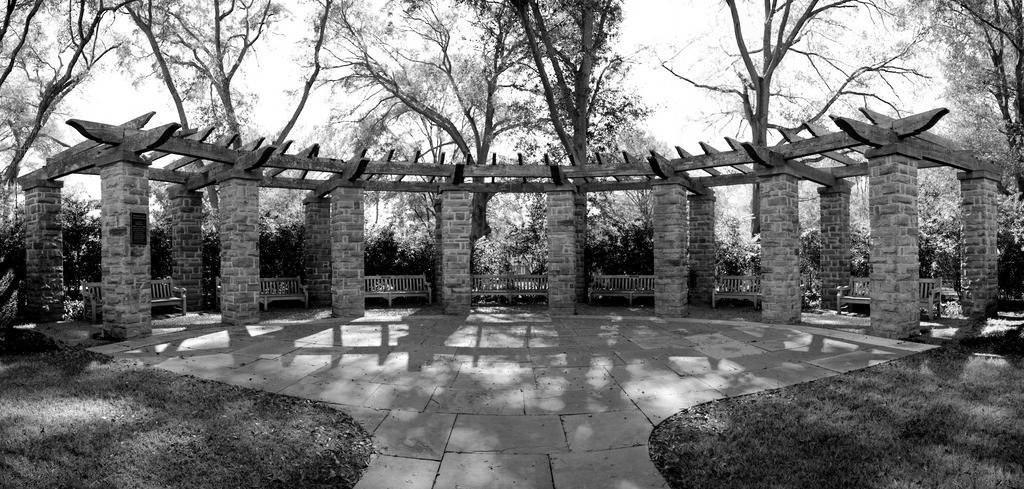 Keywords: panorama panoramic bench benches park bench columns garden pillar black and white