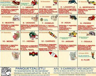 | Keywords: text screenshot XIUHPOHUALLI: CE-CUAUHTLI (1-ÁGUILA) 31/Dic/2015 - Glifo, símbolo o signo (No. 15 de 20): CUAUHTLI (ÁGUILA) [15o. día de la veintena] - Numeral 1 de 13): &quot;CE&quot; [la cuenta de la trecena indica el numeral] [no confundir con la numeración de la fecha gregoriana europea, es decir con el día] Atributos: [Señor diurno y ave llevan el mismo numero de la trecena] - Regente diurno (No. 1 de 13): XIUHTECUHTLI (El señor del fuego) - Ave compañera (No. 1 de 13): NEXHUITZILIN (Colibrí gris) - Regente de la noche (No. 1 de 9): XIUHTECUHTLI (señor del fuego) - Trecena (19 de 20): CE-CUAUHTLI (1-ÁGUILA) [31 Diciembre 2015 al 12 Enero 2016] - Veintena (15 de 18): PANQUETZALIZTLI &quot;El levantamiento de las banderas (estandartes)&quot; [Del 17 de Diciembre del 2015 al 5 de Enero del 2016] - Tlalpilli (4 de 4): CALLI [Hay 4 cargadores de años: TOCHTLI, ACATL, TECPATL, CALLI] - Año Mexhika (42 de 52): YEI-ACATL (3-CARRIZO) [12/Marzo/2015 a 11/Marzo/2016] - Xiuhmohpilli (ciclo o Atado de 52 años): En Marzo del año 2026 será el próximo encendido del FUEGO NUEVO en el cerro Huizachtepetl en Ixtapalapan [Xiuhpohualli es un calendario solar, es la cuenta astronómica o cuenta de las veintenas] ********************************************* * DESCRIPCIÓN DE LA VEINTENA * ********************************************* Veintena: PANQUEZALIZTLI &quot;El levantamiento de las banderas o estandartes&quot; 15a. Veintena del año Mexhica (equivalente al &quot;mes&quot; pero de 20 días) [Del 17 de Diciembre del 2015 al 5 de Enero del 2016] Fiesta dedicada a Huitzilopochtli la fuerza de Voluntad logradora. Es en esta veintena donde se festeja la transición al invierno, ya que las celebraciones comienzan desde 9 noches antes de la entrada del invierno, que correspondiente al 12 de Diciembre, después de esta fecha se realizan nueve noches con procesiones o marchas nocturnas que terminan aproximadamente por el día Coatl (21-22 de Diciembre); sin embargo los fríos invernales se presentan 13 días después de esa última fecha (5 de Enero). Se llama esta veintena “levantamiento de las banderas” ya que los campos de siembra mantenían esta forma rectangular que a lo lejos parecían una bandera, y en estos días ya se han levantado totalmente las cosechas, por lo que el nombre también refiere al “levantamiento total de las cosechas”. Es tiempo de dejar descansar la tierra y comenzar a adjudicar los campos entre aquellos calpulli que más trabajaron y se entregaba menos campo a los que menos trabajaron. En estos días se agradece a la naturaleza por todos los productos que ofrendó a lo largo del año, una costumbre es la de adornar árboles y arbustos existentes con papeles colgantes en sus ramas, antiguamente los adornos eran de papel amate en forma de banderas y de diferentes colores. Hoy en día venden algunos adornos en forma de espiral también. Las personas en esta veintena hacen cuenta de sus logros, aciertos, y evalúan las fallas por las cuales no hubo éxito en los planes y actividades. La fiesta principal es para celebrar el nacimiento del sol niño llamado Piltzintecuhtli “El pequeño guía”, se le llama así al sol del primer amanecer del invierno que es pequeño y muy brillante. Los 9 días posteriores al sol se le denomina Huitzilopochtli o fuerza de voluntad logradora ya que durante 9 días el sol deja de recorrerse en su andar entre el norte y el sur, dado esto se considera que el sol durante estos días tiene una gran fuerza de voluntad para tener este ciclo de inmovilidad por lo que la gente celebra ese vigor, lo toma como modelo y lo recibe para todo el año comenzando la primavera. Es durante esta veintena que Huitzilopochtli o fuerza de voluntad es festejada realizando diversas pruebas, competencias, ejercicios para la práctica de la fuerza de voluntad humana. Uno de los primeros ejercicios eran los de adaptación al frio, para los cuales las personas, debían de ir a los campos con pocas ropas para realizar caminatas, llevando antorchas y cantando alrededor de los campos de siembra. Se realizan carreras con pruebas de obstáculos a librar, encierros en cuevas, y otros ejercicios que implican el control mental que te lleva a un manejo de fuerza de voluntad interna. Antiguamente las personas que se preparaban para esta veintena lo hacían veinte días antes, durante estos días debían ir por ramas y enramar todos los altares y templos de los montes por más lejos que estuviesen, estas caminatas se hacían a la media noche y casi desnudos durante el camino iban tocando caracoles y flautas realizando cantos. Como se mencionó en la veintena pasada &quot;Quecholli&quot;. Durante todos los días de esta veintena realizaban la ceremonia llamada Tlaxotecayotl, que son cantos a Huitzilopochtli, comenzaban al atardecer y terminaban a la media noche, esto lo hacían tanto hombres como mujeres. Adornaban los arboles con tiras de papel, adornos de colores y sahumaban todos los arboles, preparaban un abono especial con comida y bebida para durante esta veintena ofrendarlo a los arboles y agradecer por sus frutos y la generación de oxigeno para nuestro consumo. A los 9 días de esta veintena se preparaban aquellos que se iban a ofrendar, se bañaban a los adeptos con agua de una fuente que se llamaba Huitzil-Atl que estaba en un pueblo llamado Huitzilopuchco (hoy mal llamado Churubusco). Las personas de mayor edad iban por esta agua y la traían en cantaros tapados con hojas de Ahuehuetl, de esta manera al llegar a donde están los estudiantes les echaban un cántaro de agua sobre la cabeza. Posteriormente se les quitaban las ropas húmedas y se les vestía con atuendos nuevos, se pintaban los brazos y las piernas con color azul claro dejando unas rayas sobre esta pintura, las caras se les pintan con bandas de color amarillo y azul atravesadas por todo el rostro. Ya atuendados se dirigían al patio de Huitzilopochtli y comenzaban una danza. A los