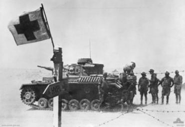 | Keywords: Panzer III with wounded near Tobruk.jpg A German Panzer III Ausf H tank bringing wounded men to a dressing station near Tobruk Libya ca 1942 The sign in the foreground points to the Hauptverbandsplatz HVPL main dressing station 042393 ca 1942 Australian armed forces Image copyright Copyright expired - public domain frame cropped PD-Australia Panzerkampfwagen III during World War II Tobruk in World War II Afrika Korps Black and white photographs | ||||