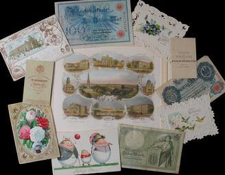 | Keywords: Paper usage.jpg Paper usage between 1850 and 1930 colored steel engraving on a souvenier sheet bank bills greetings cards luxury paper picture postcard small cards made from cardbox for photos photo by User Manfred Heyde from 1850 to 1930 PD-Art Paper |