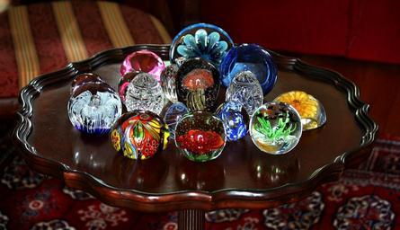 Keywords: paperweights colorful glass vignette piecrust table reflection light