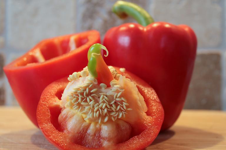 Keywords: paprika peppers vegetables food healthy red pepper rich in vitamins vegetarian vitamins vegan seeds white separating skin siel cut in half vitamin c delicious frisch juicy