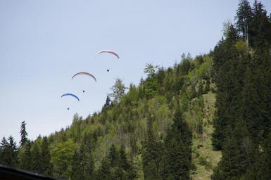 Keywords: parachute parachutist skydiving championship bavarian sky blue fly float glide mountain competition sport sport event hobby three start