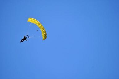 Keywords: parachutist skydiver skydiving sky parachute yellow deployed man steering
