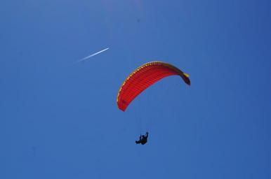 Keywords: paragliding paraglider fly sport sky flying recreation flyer red air freedom leisure blue contrail