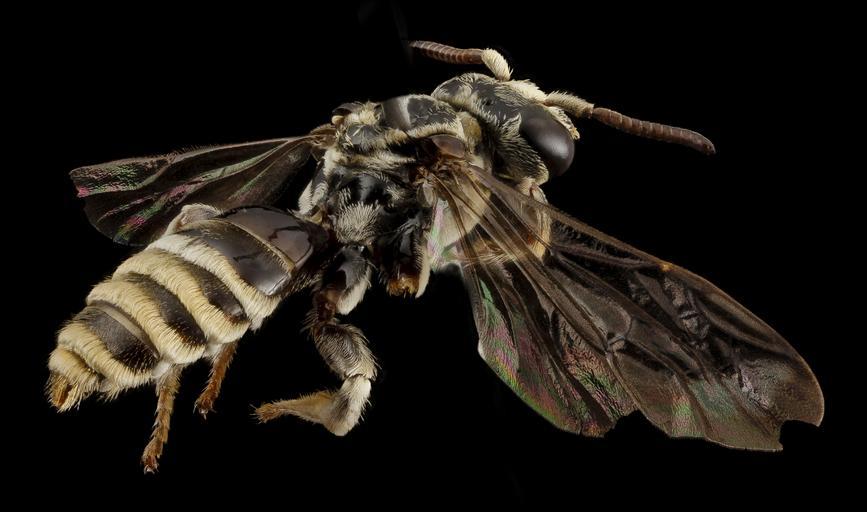 Keywords: brachynomadini taxonomy:binomial=paranomada velutina taxonomy:binomial=paranomadavelutina paranomada velutina paranomadavelutina paranomada bee bees biml usgsbiml droege arizona desert north america northamerica united states unitedstates макросъемка makro マクロ природа natur 自然 الطبيعة 大自然 naturaleza natura насекомое insekt 自然الحشرة 昆蟲 insectos nest parasite nestparasite parasite black background animal moth insect A nest parasite from the dry regions of Mexico and the Southwestern United States, this group infiltrates the communal nests of Exomalopsis to lay their eggs in the nest cells being built. Lovely combination of plush hair bands and shiny integument. ~~~~~~~~~~{{{{{{0}}}}}}~~~~~~~~~~ All photographs are public domain, feel free to download and use as you wish. Photography Information: Canon Mark II 5D, Zerene Stacker, Stackshot Sled, 65mm Canon MP-E 1-5X macro lens, Twin Macro Flash in Styrofoam Cooler, F5.0, ISO 100, Shutter Speed 200 The murmuring of bees has ceased; But murmuring of some Posterior, prophetic, Has simultaneous come,-- The lower metres of the year, When nature's laugh is done,-- The Revelations of the book Whose Genesis is June. -Emily Dickinson Want some Useful Links to the Techniques We Use? Well now here you go Citizen: Basic USGSBIML set up: www.youtube.com/watch?v=S-_yvIsucOY USGSBIML Photoshopping Technique: Note that we now have added using the burn tool at 50% opacity set to shadows to clean up the halos that bleed into the black background from "hot" color sections of the picture. www.youtube.com/watch?v=Bdmx_8zqvN4 PDF of Basic USGSBIML Photography Set Up: ftp://ftpext.usgs.gov/pub/er/md/laurel/Droege/How%20to%20Take%20MacroPhotographs%20of%20Insects%20BIML%20Lab2.pdf Google Hangout Demonstration of Techniques: plus.google.com/events/c5569losvskrv2nu606ltof8odo or www.youtube.com/watch?v=4c15neFttoU Excellent Technical Form on Stacking: www.photomacrography.net/ Contact information: Sam Droege sdroege@usgs.gov 301 497 5840 A nest parasite from the dry regions of Mexico and the Southwestern United States, this group infiltrates the communal nests of Exomalopsis to lay their eggs in the nest cells being built. Lovely combination of plush hair bands and shiny integument. ~~~~~~~~~~{{{{{{0}}}}}}~~~~~~~~~~ All photographs are public domain, feel free to download and use as you wish. Photography Information: Canon Mark II 5D, Zerene Stacker, Stackshot Sled, 65mm Canon MP-E 1-5X macro lens, Twin Macro Flash in Styrofoam Cooler, F5.0, ISO 100, Shutter Speed 200 The murmuring of bees has ceased; But murmuring of some Posterior, prophetic, Has simultaneous come,-- The lower metres of the year, When nature's laugh is done,-- The Revelations of the book Whose Genesis is June. -Emily Dickinson Want some Useful Links to the Techniques We Use? Well now here you go Citizen: Basic USGSBIML set up: www.youtube.com/watch?v=S-_yvIsucOY USGSBIML Photoshopping Technique: Note that we now have added using the burn tool at 50% opacity set to shadows to clean up the halos that bleed into the black background from "hot" color sections of the picture. www.youtube.com/watch?v=Bdmx_8zqvN4 PDF of Basic USGSBIML Photography Set Up: ftp://ftpext.usgs.gov/pub/er/md/laurel/Droege/How%20to%20Take%20MacroPhotographs%20of%20Insects%20BIML%20Lab2.pdf Google Hangout Demonstration of Techniques: plus.google.com/events/c5569losvskrv2nu606ltof8odo or www.youtube.com/watch?v=4c15neFttoU Excellent Technical Form on Stacking: www.photomacrography.net/ Contact information: Sam Droege sdroege@usgs.gov 301 497 5840