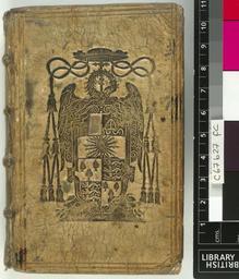 | Keywords: Paraphrasis Psalmorum Dauidis poetica - Upper cover (c67b27).jpg Style Armorial; Caption Upper cover; Colour White / cream; Edge Unspecified exhibition history Decorative Technique Tooled in blind Tooled in alloy frequently gold and silver zwischen gold ; Cover Material Leather unspecified 4 raised bands on spine Coat of arms of a cleric May be German or Dutch May be 17c The tooling may be oxidised gold or silver object history Text 1567; Unspecified; Unspecified object type Cc-zero place of creation Binding Germany place of discovery Unspecified British Library image http //www bl uk/catalogues/bookbindings/LargeImage aspx RecordId 020-000012000 ImageId ImageId 45605 Copyright BL Paraphrasis Psalmorum Dauidis poetica Uploaded with GWToolset Paraphrasis Psalmorum Dauidis poetica - Upper cover c67b27 http //www webarchive org uk/bldatasets/bindings/12950_4 jpg Bookbinding 17th-century bookbinding British Library Bookbindings |