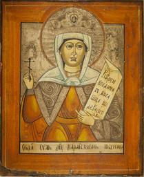 | Keywords: Paraskeva (19th c, Kostroma museum).jpg ru Па аскева Иконийская Пятница великомученица ате иал Де ево темпе а Разме ы иконы высота 40 см ши ина 31 см Икона к аснушка Однофигу ная композиция побед енно к упным планом в фас а голове белый плат ко она в цент е ее в медальоне Спас е укотво ный в п авой уке к ест левой подде живает азве нутый свиток с текстом Цвета одежд белые светло-ох истые над головой нимб оче чен к асной ох ой Фон светлый канфа ение по левкасу к ужочками и завитками Инв КП 04550 Кост омской госуда ственный исто ико-а хитекту ный и художественный музей-заповедник century 19 http //www iconrussia ru/icon/detail php ID 10929 author Custom license marker 2013 07 22 PD-Art-100 Uploaded with UploadWizard Paraskeva Pyatnitsa Icons of Paraskeva 1800 Kostroma Historical and Architectural Museum-Reserve 19th-century icons of Russia |