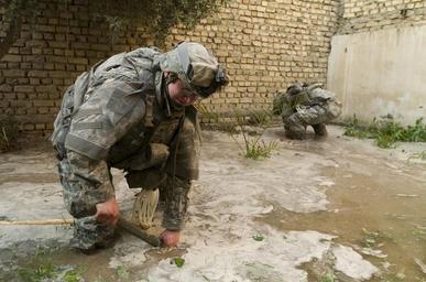 | Keywords: Paratroopers make progress against insurgents in Adhamiyah DVIDS40372.jpg en Spc Wesley Van der Velde of Provincetown Ill left and Spc Marcus Tiller of Daytona Fla right paratroopers with A Company 325th Special Troops Battalion 2nd Brigade Combat Team 82nd Airborne Division search for a hidden weapons cache at a suspected insurgent's house in Adhamiyah March 22 A car bomb had destroyed the house and flooded it with water from a broken main turning the search area into a muddy soup 2007-03-22 Staff Sgt Michael Pryor https //www dvidshub net/image/40372 40372 2007-04-03 10 41 BAGHDAD IQ PD-USGov 82nd Airborne Division Images from DoD uploaded by Fæ |