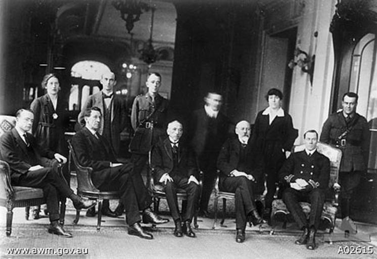 | Keywords: Paris 1919 Australian delegation.jpg The Australian delegation to the Paris Peace Conference at the end of World War I From left to right Lieutenant P E Deane secretary to Billy Hughes Miss Wood typist Sir Robert Garran Solicitor-General of Australia W E Corrigan messenger Captain H S Gullett press officer Billy Hughes Prime Minister of Australia R Mungovan secretary to Sir Joseph Cook Sir Joseph Cook Minister for the Navy Miss Carter typist Lieutenant Commander John Latham Commander Naval Intelligence Lieutenant F W Eggleston assistant to Sir Robert Garran http //cas awm gov au/PROD/cst acct_master surl 1065299030ZZIQZLUQTXAR57378 stype 3 simplesearch v_umo v_product_id screen_name cas_search_pkg pr_search_by_link screen_parms acid~ps_query_type accnum~ps_query A02615~ps_referrer oai awm 581/2000466 screen_type BOTTOM bvers 5 bplatform Netscape bos Win32 Australian War Memorial 1919 Author N/A see licencing below The photograph was taken in Paris France The place of first publication is unknown If it is in Australia which is likely then it is PD-Australia as a photograph taken before 1 January 1955 PD-Australia However if this is not the case or for some other reason Australian law does not apply to the image the image is in the public domain as an anonymous work more than 70 years old where the creator did not publish the image under their name or disclose their authorship within 70 years Anonymous-EU Paris Peace Conference 1919 Billy Hughes Robert Garran Joseph Cook Black and white photographs John Latham judge |