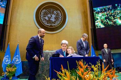 | Keywords: secretary kerry secretarykerry united nations unitednations cop21 new york newyork un earth day earthday climate global warming globalwarming "U.S. Secretary of State John Kerry, with his two-year-old granddaughter Isabelle Dobbs-Higginson on his lap and United Nations Secretary-General Ban ki-Moon looking on [on the far right], signs the COP21 Climate Change Agreement on behalf of the United States during a ceremony on Earth Day, April 22, 2016, at the U.N. General Assembly Hall in New York, New York." — U.S. State Department photo 22 April 2016. Public Domain "U.S. Secretary of State John Kerry, with his two-year-old granddaughter Isabelle Dobbs-Higginson on his lap and United Nations Secretary-General Ban ki-Moon looking on [on the far right], signs the COP21 Climate Change Agreement on behalf of the United States during a ceremony on Earth Day, April 22, 2016, at the U.N. General Assembly Hall in New York, New York." — U.S. State Department photo 22 April 2016. Public Domain |