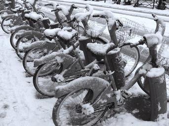 Keywords: paris france city bicycles black and white winter snow ice street urban cities outside cold lined up row transportation