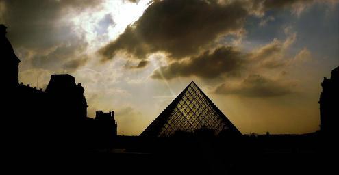 Keywords: paris france louvre pyramid museum architecture landmark places of interest city building historically famous sky clouds cloud formation sunbeam lichtspiel reflections dusk mood abendstimmung atmosphere twilight