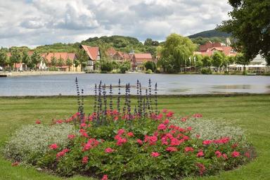 Keywords: park pond water flowers walk green area place city center sky clouds