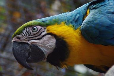 Keywords: parrot bird plumage colorful color ara head bill feather yellow blue eye nature close