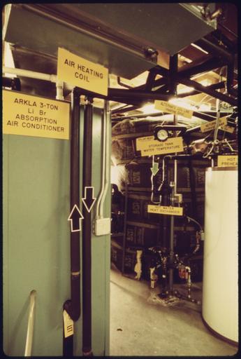 | Keywords: PART OF THE PLUMBING AND ASSOCIATED EQUIPMENT FOR THE SOLAR HEATING AND COOLING DEMONSTRATION PROJECT, FUNDED BY THE... - NARA - 557315.jpg Scope and content PART OF THE PLUMBING AND ASSOCIATED EQUIPMENT FOR THE SOLAR HEATING AND COOLING DEMONSTRATION PROJECT FUNDED BY THE NATIONAL SCIENCE FOUNDATION IT IS A LIQUID AS OPPOSED TO A HOT AIR SYSTEM FLAT PLATE COLLECTORS ON THE ROOF OF THE DEMONSTRATION HOME HAVE BLACKENED COPPER TUBING TO ABSORB HEAT FROM THE SUN HEATED WATER IS THEN PIPED THROUGH THE HOUSE TO HEAT IT IN ADDITION A LITHIUM BROMIDE ABSORPTION AIR CONDITIONING SYSTEM IS INCORPORATED USING THE HEAT REJECTION PRINCIPLE OF A THERMODYNAMIC CYCLE LIKE A REFRIGERATOR General notes 557315 Local identifier 412-DA-14863 Environmental Protection Agency 12/02/1970 - NARA-Author Norton Boyd 1936- Photographer 1111093 <br /> Fort Collins Larimer county Colorado United States North and Central America inhabited place 4201604 40 583 -105 08 <br /> Still Picture Records Section Special Media Archives Services Division NWCS-S National Archives at College Park 8601 Adelphi Road College Park MD 20740-6001 05/1975 Record group Record Group 412 Records of the Environmental Protection Agency 1944 - 2006 Record group ARC 708 DOCUMERICA The Environmental Protection Agency's Program to Photographically Document Subjects of Environmental Concern compiled 1972 - 1977 Series ARC 542493 File unit File unit ARC Variant control numbers Agency-Assigned Identifier 248/43/014863<br /> NAIL Control Number NWDNS-412-DA-14863 Other versions <gallery> File PART_OF_THE_PLUMBING_AND_ASSOCIATED_EQUIPMENT_FOR_THE_SOLAR_HEATING_AND_COOLING_DEMONSTRATION_PROJECT _FUNDED_BY_THE _-_NARA_-_557315 tif tif File PART_OF_THE_PLUMBING_AND_ASSOCIATED_EQUIPMENT_FOR_THE_SOLAR_HEATING_AND_COOLING_DEMONSTRATION_PROJECT _FUNDED_BY_THE _-_NARA_-_557315 jpg jpg </gallery> NARA-cooperation PD-USGov Solar energy in the United States |