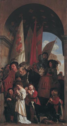 | Keywords: Part of the Triumphal Procession, with Musicians and captured Banners, by Salomon de Bray.jpg en Part of the Triumphal Procession with Musicians and captured Banners oil on canvas 384 x 206 cm signed b r SD Bray “ 1649 1649 https //rkd nl/en/explore/images/246782 Paleis Huis ten Bosch Oranjezaal Creator Salomon de Bray other versions Custom license marker 2016 11 29 PD-old-100 Salomon de Bray 1649 Oranjezaal 1649 | ||||