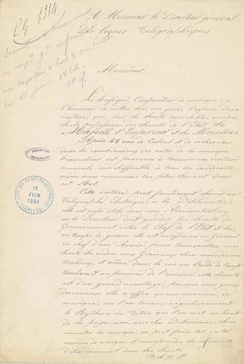 Keywords: Partition musicale du compositeur Maurice de Raoulx avec une invention de code sous forme de notes de musique - Archives Nationales - 19860703-610 - (1).jpg Transcribe Archives Nationales de France Partition musicale du compositeur Maurice de Raoulx avec une invention de code sous forme de notes de musique 1854 paper Institution Archives nationales France object history exhibition history credit line Archives Nationales cooperation project http //www archives-nationales culture gouv fr/web/guest/le-secret-de-l-etat PD-old-100-1923 accession number 19860703/610 Collections of Archives nationales France Media contributed by the Archives Nationales France /8 Le secret de l ™Ã‰tat - Archives Nationales |