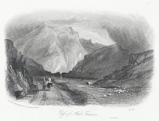 | Keywords: Pass of Nant Francon.jpeg Abstract A man with rifle amd a woman on horseback travelling along the mountain road through Nant Ffrancon Size mm 213 156 exhibition history Institution National Library of Wales Technique print engraving bw object history object type PD-old-70-1923 place of creation place of discovery 1132309 Pass of Nant Francon Uploaded with GWToolset Pass of Nant Francon http //dams llgc org uk/behaviour/llgc-id 1132309/fedora-bdef image/reference Images uploaded as part of NLW - WMUK collaboration Welsh Landscape Collection Nant Francon Nant Ffrancon 1841 engravings Mountains of Wales Mountain roads Sheep in Wales |