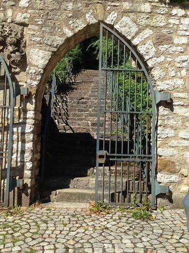 Keywords: passage wall metal grid stone stairs plant middle ages archway gradually staircase architecture emergence patch