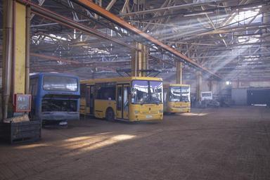 Keywords: passenger bus repair shop plant hangar yellow dusty