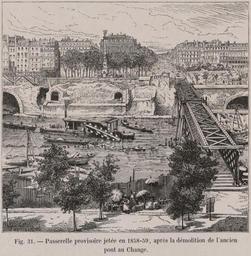 | Keywords: Passerelle provisoire jetée en 1858-59, après la démolition de l'ancien Pont au change.jpg Artwork The 1858-1859 pedestrian bridge that was temporarily built to replace the recently demolished Pont au change The Pont au change bridge was originally built in 1647 and was located in the Châtelet district 1875-1882 lithograph 9 8 x 10 6 cm Institution Brown University Library object history exhibition history credit line Published in Theodor Josef Hubert Hoffbauer Paris à travers les âges Paris Firmin-Didot et cie 1885 accession number 1172175960306100 PD-old Lithographs of Paris Images of Paris from the Brown University Library Paris à travers les âges Historical images of Pont au Change Footbridges in Paris 1858 in Paris 1859 in Paris Temporary buildings in France Temporary bridges Place du Châtelet Paris |