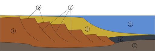 | Keywords: Passive margin.svg pl Przekrój przez pasywną krawędź kontynentu powstałą przez ryftowanie 1 skorupa kontynentalna 2 skorupa oceaniczna 3 sedymenty 4 skały płaszcza 5 ocean 6 powierzchnie zapadające ku kontynentowi dające refleksy sejsmiczne 7 uskoki listryczne en Rifted passive margin cross-section 1 continental crust 2 oceanic crust 3 sediments 4 mantle 5 ocean 6 continent-dipping seismic reflector facies 7 listric faults 2012-12-02 17 50 09 own Szczureq Based on File PMfinal png cc-zero Uploaded with UploadWizard Structural geology diagrams SVG geology Passive margins |