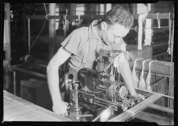 | Keywords: "Paterson, New Jersey - Textiles - Wishnack Silk Company - A machine twister is shown being operated" - NARA - 518761.tif Scope and content Paterson New Jersey - Textiles Wishnack Silk Company A machine twister is shown being operated This particular machine is made by the Warp Twisting-In Machine Company The machine will twist in the ordinary warp of 5-6000 ends in about 1 to 1-1/4 hours depending upong whether the automatic or semi-automatic power is used It is estimated that the machine can twist approximately 300 ends per minute This estimate is substantially correct for both the automatic and semi-automatic types of operation The semi-automatic power is applied by turning the handle and wheel drive shown opposite the worker's right forearm When operated automatically the operative keeps the power turned on with the lever he is holding in his right hand Both kinds of operation are necessary since the machine is not so well adapted to rayon and other inferior types of yarn as it is to good quality hard silk Twisting in the former type of yarn requires more care and less speed hence the use of the semi-automatic device A General notes 518761 Local identifier 69-RP-704 Federal Works Agency Work Projects Administration National Research Project ca 1941 - ca 1942 NARA-Author Hine Lewis Wickes 1874-1940 Photographer 1122914 <br /> Paterson Passaic New Jersey United States North and Central America inhabited place 4202736 40 917 -74 167 <br /> Still Picture Records Section Special Media Archives Services Division NWCS-S National Archives at College Park 8601 Adelphi Road College Park MD 20740-6001 1937-06 Record group Record Group 69 Records of the Work Projects Administration 1922 - 1944 Record group ARC 398 Lewis Hine Photographs for the National Research Project compiled 1936 - 1937 Series ARC 518291 File unit File unit ARC Variant control numbers NAIL Control Number NWDNS-69-RP-704 yes Other versions <gallery> File Paterson _New_Jersey_-_Textiles_-_Wishnack_Silk_Company_-_A_machine_twister_is_shown_being_operated _-_NARA_-_518761 tif tif File Paterson _New_Jersey_-_Textiles_-_Wishnack_Silk_Company_-_A_machine_twister_is_shown_being_operated _-_NARA_-_518761 jpg jpg </gallery> NARA-cooperation PD-USGov Weaving preparation Paterson New Jersey-Textiles Men at work in the United States NARA TIF images with categorized JPGs |