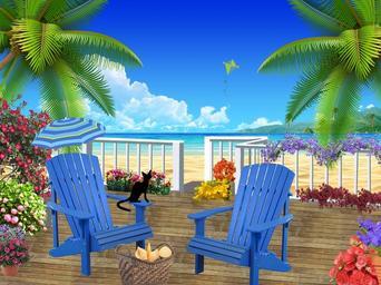 Keywords: patio ocean summer chairs flowers tranquility plants flowering black cat nature seaside relaxation kite adirondack chairs sunshade shells palm trees