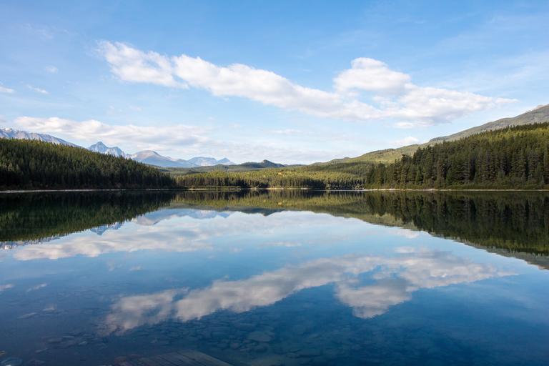 Keywords: patricia lake reflection canada jasper lake alberta park outdoors nature water scenic rocky mountain national landscape canadian tourism travel sky forest tree green scene cloud