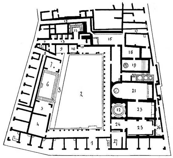 | Keywords: Pauly-Wissowa II2 2751-Stabianer-Thermen-Pompeii.png de Grundriss der sog Stabianer Thermen in Pompeii<br>Durch den Haupteingang 1 und den Nebeneingang 8 betritt man die Palaestra 2; rechts an dieser ist 3 eine mit Fliesen belegte Bahn auf der von 9 aus Steinkugeln gerollt wurden deren zwei hier gefunden sind 10 Platz eines Aufsehers der Palaestra Weiter links das Schwimmbassin 6 und neben demselben zwei ursprünglich je ein flaches Bassin enthaltende bedeckte Räume 5 und 7 etwa 0 65 m tief in welche aus der Westwand ein Wasserstrahl fiel Sie dienten wohl zu Abwaschungen und Douchebädern; doch ist in 7 das Bassin später ausgefüllt und der Raum anderweitig verwandt worden 4 Auskleideraum mit Spuren von Schränken an den Wänden Rechts an der Palaestra die eigentlichen Baderäume 21 “25 Männer- 16 “19 Frauenbad in der Mitte zwischen beiden die Heizvorrichtung 20 Und zwar sind 24 + 25 und 16 Apodyterien dieses mit zwei besonderen Strasseneingängen 15 17 jenes mit zwei Vorräumen 26 27 welche Bänke für die wartenden Diener enthalten 22 Frigidarium während 16 in einer Ecke das Bassin für das kalte Bad enthält 18 23 Tepidarien 19 21 Caldarien beide mit alveus am einen und labrum am anderen Ende Endlich liegen an dem Gange 13 mit Eingang von der Strasse und von der Palaestra vier in der letzten Zeit nicht gebrauchte Einzelzellen mit je einer gemauerten Wanne und der Abtritt 14 Beschreibung vom Urheber Paulys Realencyclopädie der classischen Altertumswissenschaft Band II 2 Sp 2751-2752 August Mau 1896 PD-old Paulys Realencyclopädie der classischen Altertumswissenschaft Band II 2 Maps from Pauly-Wissowa Stabian Thermae Pompeii August Mau Plans of ancient Roman thermae in Pompeii |
