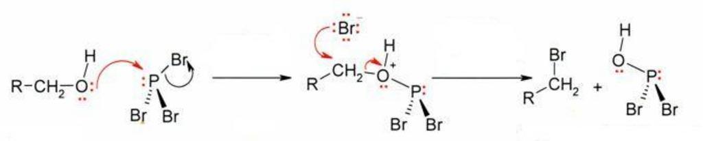 Keywords: PBr3 alcohol.jpg en The mechanism shown for a primary alcohol involves initial activation of the alcohol oxygen by the electrophilic phosphorus to form a good leaving group followed by an SN2 substitution at the alcohol carbon own Secalinum 2010-05-26 Chemical reactions |
