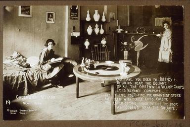 | Keywords: jessie tarbox beals jessietarboxbeals photographs greenwich village greenwichvillage new york city newyorkcity sheridan square sheridansquare bohemians women photographers womenphotographers photojournalists jolin's jolins photo border Joan Schromache and Lin inside their shop, Jolin's, ca. 1915-1926. Photographer: Jessie Tarbox Beals Catalog record Questions? Ask a Schlesinger Librarian Joan Schromache and Lin inside their shop, Jolin's, ca. 1915-1926. Photographer: Jessie Tarbox Beals Catalog record Questions? Ask a Schlesinger Librarian |