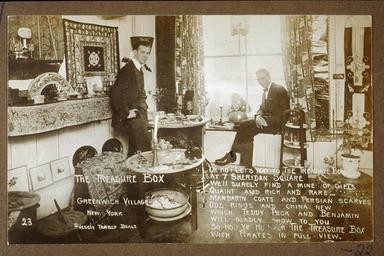 | Keywords: jessie tarbox beals jessietarboxbeals greenwich village greenwichvillage photographs sheridan square sheridansquare women photographers womenphotographers indoor Group portrait of Teddy Peck and Romayne Benjamin in their retail shop, The Treasure Box, ca. 1912-1920. Photographer: Jessie Tarbox Beals Catalog record Questions? Ask a Schlesinger Librarian Group portrait of Teddy Peck and Romayne Benjamin in their retail shop, The Treasure Box, ca. 1912-1920. Photographer: Jessie Tarbox Beals Catalog record Questions? Ask a Schlesinger Librarian |