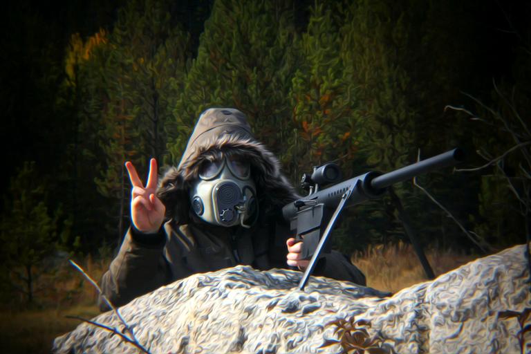 | Keywords: 1 Thessalonians 5:3: While people are saying, "Peace and safety," destruction will come on them suddenly, as labor pains on a pregnant woman, and they will not escape. holgalens paint gun gasmask trees rock peace person man male canada |