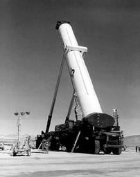 | Keywords: Peacekeeper - experimental transporter.jpg en An experimental MX missile transporter carrying a mock MX Peacekeeper missile dwarfs workers standing below http //www staynehoff net/mx7 jpg Federal Government of the United States PD-USGov LGM-118 Peacekeeper Jackass Flats |