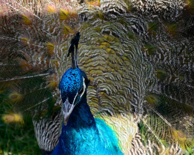 Keywords: peacock bird feather blue iridescent peacock feathers wheel head plumage