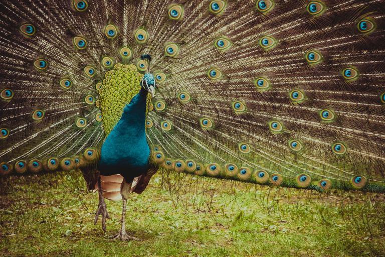 Keywords: peacock bird plumage animal colorful tail wildlife fowl vibrant feather pattern majestic exotic peafowl