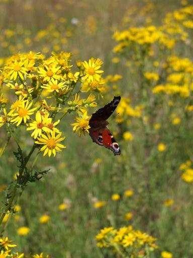 Keywords: peacock butterfly butterfly insect animal pattern wing colorful flower meadow jakobs greiskraut blossom bloom yellow peacock