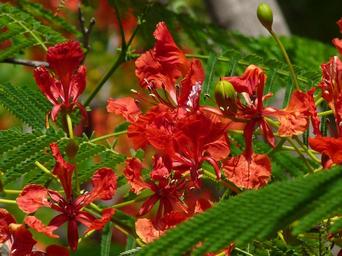 | Keywords: peacock flowerd reddish orange blossoms blooms racemes blooming bunch red bird of paradise caesalpinia pulcherrima buds shoots flowering plants green leaves leafy fleurs decorative ornamental fiery red petals colorful bright barbados pride shrubs gardens gardening |