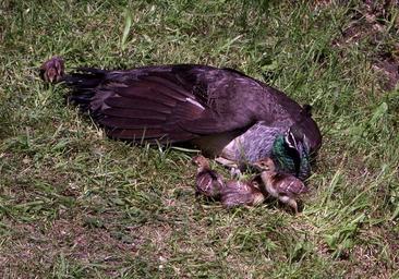 Keywords: Peacock with chicken.jpg Pavo cristatus Zoo Ústí nad Labem Czechia Peacock female with chicks in ZOO Ústí nad Labem Own 2007-06-07 Makhiel Pavo cristatus captive families Birds in Zoo Ústí nad Labem