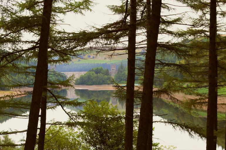 Keywords: peak district reservoir upper derwent reservoir dam howden dam 617 squadron dam busters trees calm water reflections