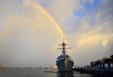 Keywords: pearl harbor hawaii battleship navy rainbow sky clouds bay harbor port water outside