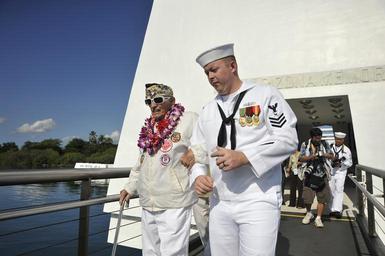 | Keywords: Pearl Harbor remembered 131207-N-IU636-100.jpg en Pearl Harbor survivor Lou Conter and Electronic Technician 1st Class Michael Temple assigned to Navy Information Operations Center Hawaii visit the USS Arizona Memorial during the 72nd anniversary Pearl Harbor Day commemoration Pearl Harbor survivors and distinguished guests visited the memorial for the presentation of wreaths More than 2 500 guests including Pearl Harbor survivors and other veterans attended the National Park Service and U S Navy-hosted joint memorial ceremony at the World War II Valor in the Pacific National Monument U S Navy photo by Mass Communication Specialist Seaman Johans Chavarro/Released 2013-12-07 Petty Officer 3rd Class Johans Chavarro https //www dvidshub net/image/1069067 131207-N-IU636-100 2013-12-10 04 09 PEARL HARBOR HI US PD-USGov-Military-Navy USS Arizona Memorial Images from DoD uploaded by Fæ 72nd anniversary of Pearl Harbor attacks |