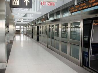 | Keywords: Pearson T3 LINK Station.jpg en The arrival and departure platform of the LINK Train's Terminal 3 station at Terminal 3 of Toronto Pearson International Airport in Toronto Canada The train visible on the right is about to depart for Viscount station Own GTD Aquitaine 2008-07-22 LINK Train Interior of Toronto Pearson International Airport July 2008 in Canada 2008 in Toronto 2008 in rail transport in Canada Full-height platform screen doors Bilingual signs in Canada Exit signs | ||||