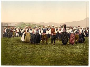 | Keywords: Peasants Dancing, Bosnia, Austro-Hungary WDL2638.png Artwork ru Танцующие к естьяне Босния Авст ия-Венг ия fr Danse de paysans Bosnie Autriche-Hongrie en Peasants Dancing Bosnia Austro-Hungary zh 正 舞蹈的 民(奥匈 国统治时代的波斯尼亚) pt Camponeses Dançando Bósnia Austro-Hungria ar رقص الفلاحين، البوسنة، المجر النمساوية ru Данный цветной снимок относится к коллекции Виды Авст о-Венге ской импе ии в кото ой соб аны фотог афии популя ных ту истических цент ов Восточной и Цент альной Ев опы конца XIX века анее известной как Авст о-Венге ская импе ия из каталога Дет ойт Паблишинг Кампани Босния была завоевана ту ками Османской импе ии в 1463 году После усско-ту ецкой войны 1877-1878 годов по ешению Бе линского Конг есса 1878 г Авст о-Венг ия получила мандат на оккупацию и уп авление Боснией и Ге цеговиной кото ые до 1908 года фо мально п одолжали находиться под уп авлением и конт олем Османской импе ии а данном снимке изоб ажены к естьяне в т адиционных костюмах исполняющие танец в подписи к снимку сделанной на немецком языке поясняется что это танец коло аселение Боснии и Ге цеговины составляли п еимущественно сельские жители; в 1895 году 88 п оцентов населения было занято в сельском хозяйстве Дет ойт Фотог афик Кампани была основана в конце 90-х годов XIX века в качестве издательской компании выпускающей фотоп одукцию бизнесменом и издателем из Дет ойта Уильямом А Ливингстоном младшим совместно с фотог афом и фотоиздателем Эдвином Г Хаше ом Они п иоб ели эксклюзивные п ава на использование п оцесса фотох оми ования изоб етенного в Швейца ии Фотох оми ование использовалось для п ев ащения че но-белых фотог афий в цветные и последующей печати фотог афий методом фотолитог афии Благода я этому инновационному п оцессу стало возможно массовое п оизводство цветных отк ыток снимков и альбомов для п одажи на аме иканском ынке В 1905 году компания была п еоб азована в Дет ойт Паблишинг Кампани <br> а одные танцы fr Ce cliché photochrome provient de Vues de l'Empire austro-hongrois une sélection de photographies de la fin du 19ème siècle des sites touristiques en Europe centrale et orientale connues auparavant comme l'Empire austro-hongrois qui faisait partie du catalogue de la Detroit Publishing Company La Bosnie a été conquise par les Turcs ottomans en 1463 Après la guerre russo-turque de 1877-78 le Congrès de Berlin 1878 donna à l'Autriche-Hongrie un mandat pour occuper et gouverner la Bosnie-Herzégovine qui demeura sous souveraineté ottomane officielle jusqu'en 1908 On voit ici des paysans en costume traditionnel exécutant une danse identifiée par la légende en allemand comme la <em>kolotanz</em> La population de la Bosnie-Herzégovine était essentiellement rurale ; en 1895 88 pour cent de la population était employée dans l'agriculture La Detroit Photographic Company était une maison d'édition photographique créée à la fin des années 1890 par l'homme d'affaires et éditeur de Detroit William A Livingstone Jr en association avec le photographe et photo-éditeur Edwin H Husher Ils obtinrent les droits exclusifs d'utilisation du processus suisse Photochrome pour la conversion de photographies noir et blanc en images couleur ainsi que leur impression par photolithographie Ce processus permit la production en série de cartes postales tirages et albums en couleur vendus sur le marché américain L'entreprise devint la Detroit Publishing Company en 1905 <br>Danse folklorique en This photochrome print is part of Views of the Austro-Hungarian Empire a selection of photographs of late-19th-century tourist sites in Eastern and Central Europe formerly the Austro-Hungarian Empire in the catalog of the Detroit Publishing Company Bosnia was conquered by the Ottoman Turks in 1463 Following the Russo-Turkish War of 1877 78 the Congress of Berlin 1878 gave Austria-Hungary a mandate to occupy and govern Bosnia and Herzegovina which remained under nominal Ottoman sovereignty until 1908 Shown here are peasants in traditional dress performing a dance identified on the print in German as the <em>kolotanz</em> The population of Bosnia and Herzegovina was overwhelmingly rural; in 1895 88 percent of the population was employed in agriculture The Detroit Photographic Company was launched as a photographic publishing firm in the late 1890s by Detroit businessman and publisher William A Livingstone Jr and photographer and photo-publisher Edwin H Husher They obtained exclusive rights to use the Swiss Photochrom process for converting black-and-white photographs into color images and printing them by photolithography This innovative process was 