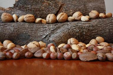 Keywords: Pecans, hazelnuts, walnuts, almonds, Brazil nuts on a table with logs 2.jpg en pecans hazelnuts walnuts almonds Brazil nuts on a table with logs 2016-12-22 15 50 07 own Baileynorwood other versions cc-zero Nuts